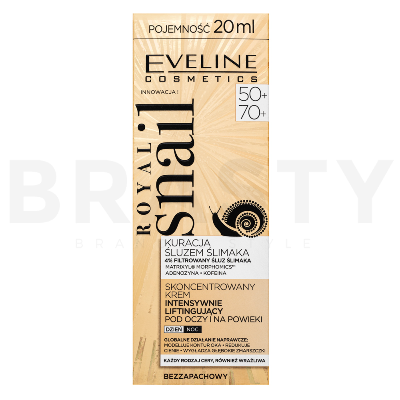 Fedezze fel az Eveline Royal Snail Concentrated Intensely Lifting Eye Cream 50+/70+ erejét, amely forradalmat hoz az érett bőr ápolásában. Ez a liftinges feszesítő ránctalanító krém kifejezetten azoknak a nőknek készült, akik hatékony megoldást keresnek a szemkörnyék finom területére. Az Eveline Royal Snail kollekció híres arról, hogy innovatív technológiákat ötvöz természetes összetevőkkel, így biztosítva a maximális hatékonyságot és látható eredményeket.