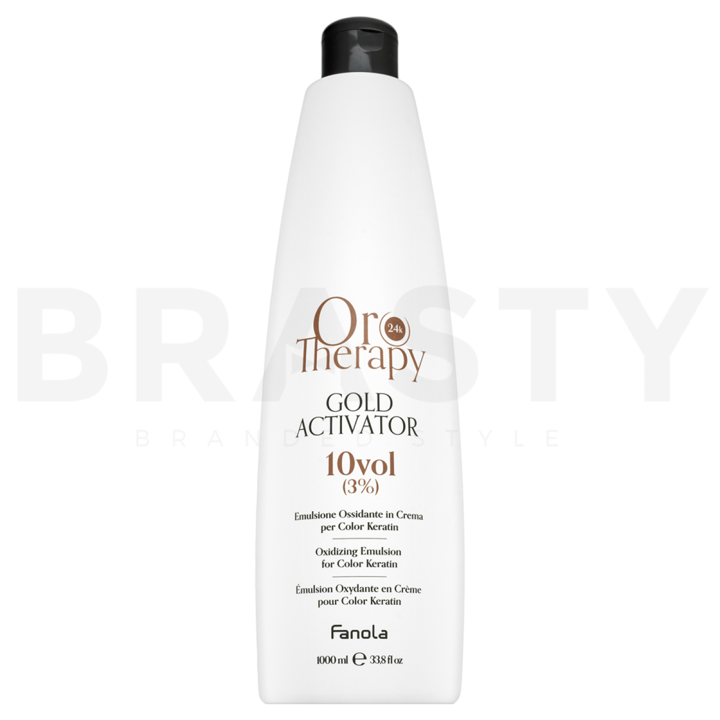 AFanola Oro Therapy 24k Gold Activator Oro Puro egy fejlesztő emulzió, amelyet a haj színezésére és világosítására terveztek, intenzív ápolással és védelemmel. Ez a 9% hidrogén-peroxidot (30 Vol.) tartalmazó emulzió ideális választás a professzionális színezési és világosítási technikákhoz. Az exkluzív Fanola Oro Therapy termékcsalád része, amely a 24K arany és más ápoló összetevők erejét használja fel, hogy ne csak tökéletes eredményt érjen el, hanem hidratálást, fényt és védelmet is nyújtson a színezett hajnak. A FanolaOro Therapy 24k Gold Activator Oro Puro egy rendkívül hatékony fejlesztő emulzió, amely egyenletes és megbízható színezési és világosítási eredményeket tesz lehetővé, miközben táplálja és fényessé teszi a hajat.
